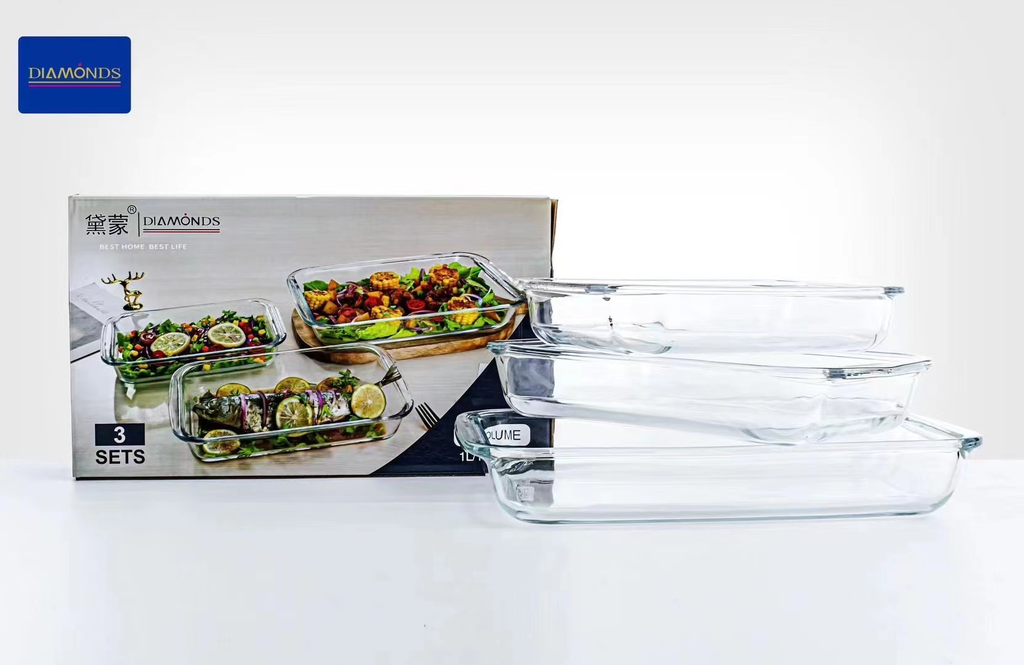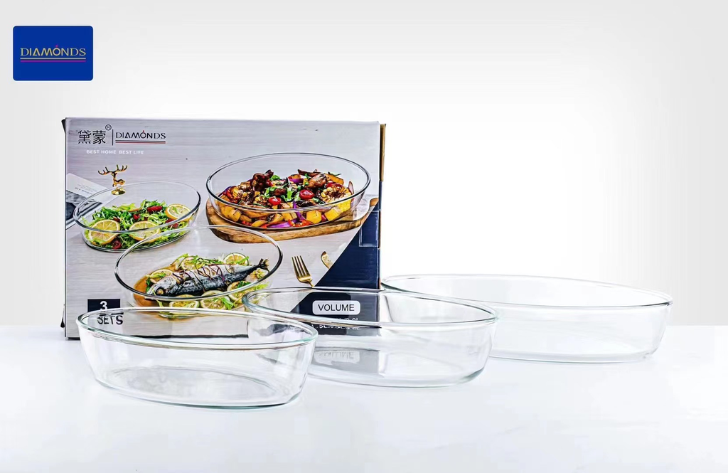 set of three oval borosilicate glass baking dishes/serving bowls